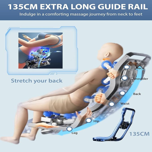 Super Long SL Track for Full-Body Adaptation: The elongated SL track of this massage chair full body glides seamlessly along the natural curves of your body, targeting the neck, shoulders, back, waist, hips, and legs. This design helps relax the spine and relieve muscle tension, providing a complete and rejuvenating massage experience.